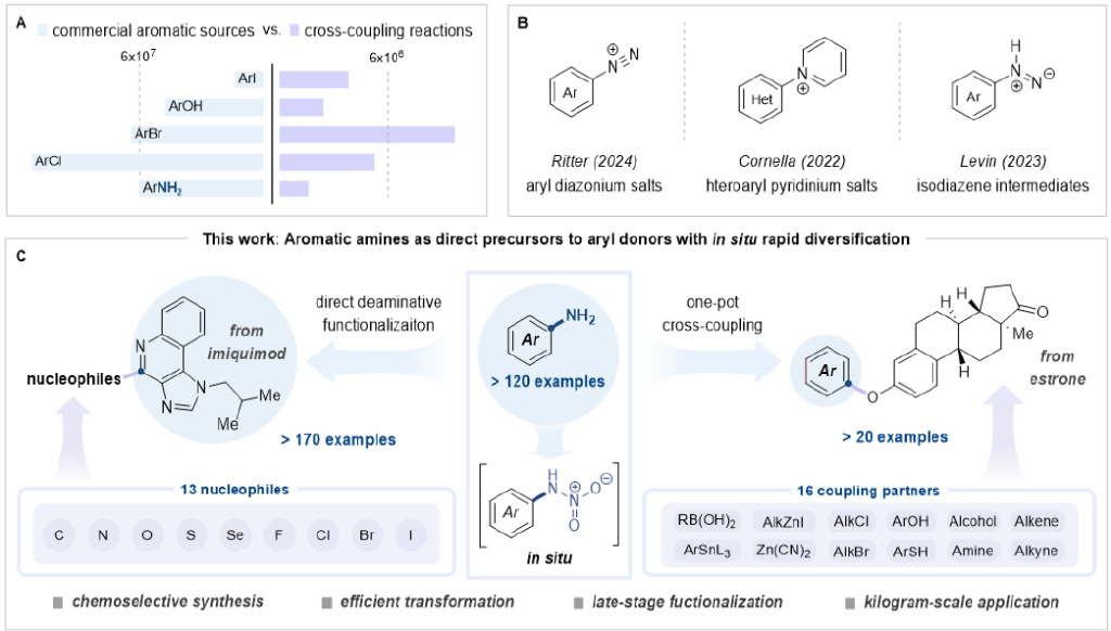 新研究提出了一种能够高效将惰性芳香碳-氮键直接转化为多种重要化学键(包括碳-卤素键、碳-氧键及碳-碳键等)的全新方法。研究人员利用芳香胺在硝酸介导下原位形成N-硝胺中间体,这个中间体会进一步转化,脱除一氧化二氮(N₂O),并产生高活性的“芳基阳离子”等价物。该高活性物种可以被亲核试剂捕获,从而实现芳香C−N键向多种C−X键以及C−C键的高效直接转化。