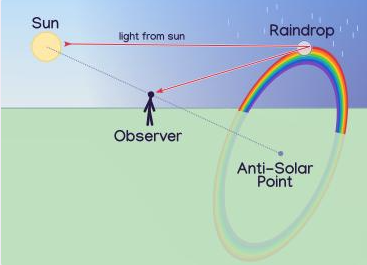 当被分解成彩色的光线从水滴射出的时候,并不是朝所有方向乱飞,而是在42度的位置最为集中,注意,这里的42度不是相对于地面或天空测量的,而是相对于反日点方向。所有与这个方向偏离42度的方向上,都有彩色光线进入你的眼睛。