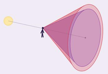 我们先来认识一下反日点,这指的是天空中与太阳位置正好相对的那个点。如果用观测彩虹的经验就会知道,看彩虹时太阳一定在我们身后。那么从太阳出发,画一条线穿过脑袋,一直延伸到前方,这条线指向的方向,就是反日点的方向。通俗地说,就是你头部阴影的延长线指向的地方。如果你此时我们站在地面上,这个反日点就会在地平线以下。