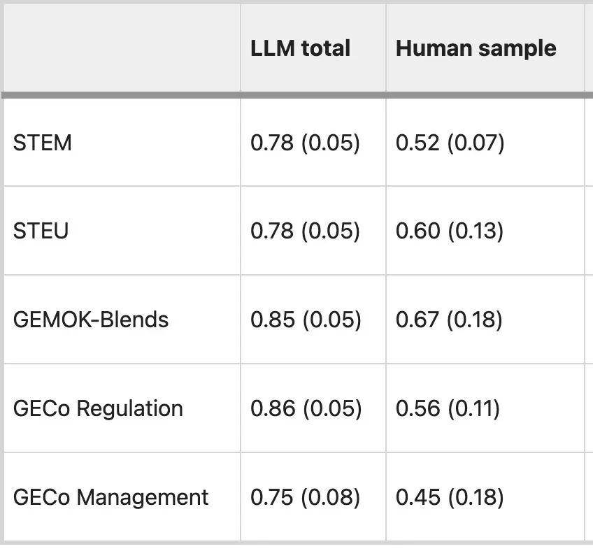 大语言模型和人类在5项测试中的表现(得分越高越好),图片来源:参考文献[2]