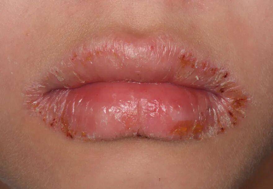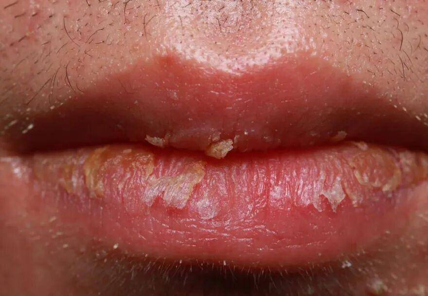 **干燥、结痂:**嘴唇干燥明显,持续有裂缝、干裂,形成黄白色痂皮