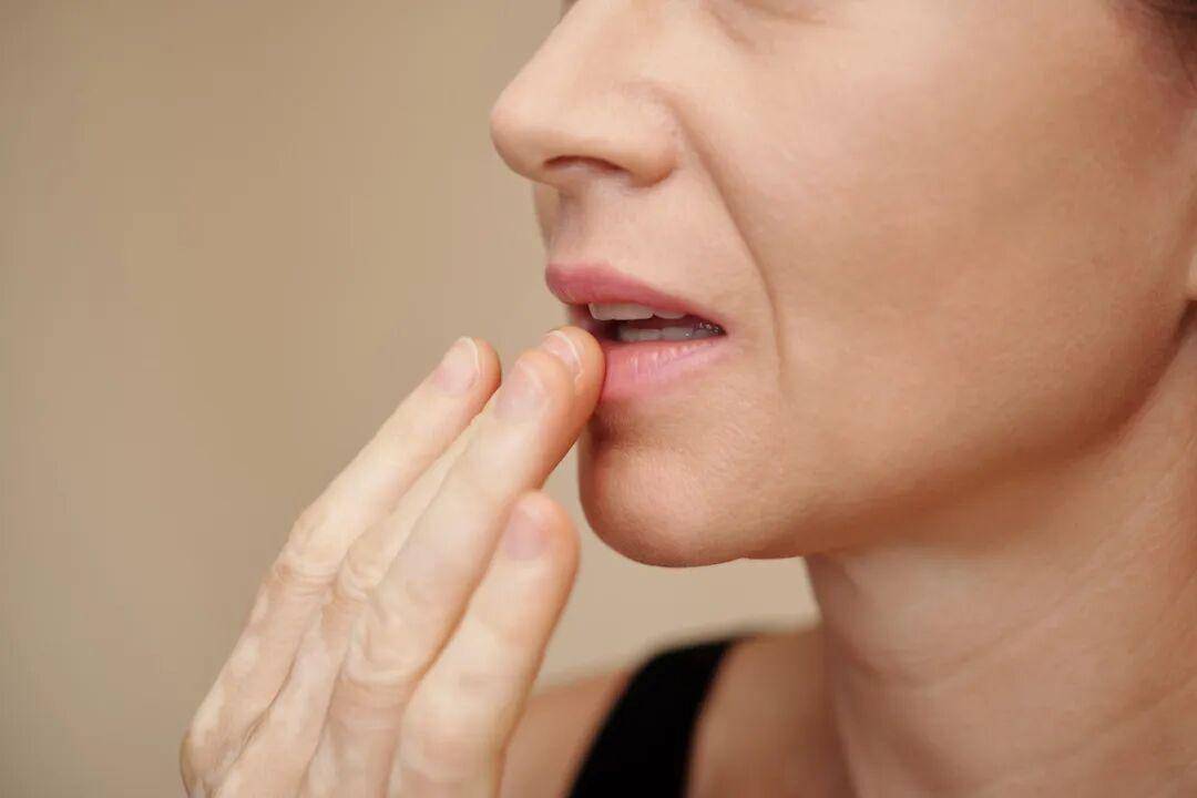 **主观感受:**烧灼、瘙痒、敏感、麻刺或疼痛。严重的疼痛或干裂可能影响进食和说话,并限制张口