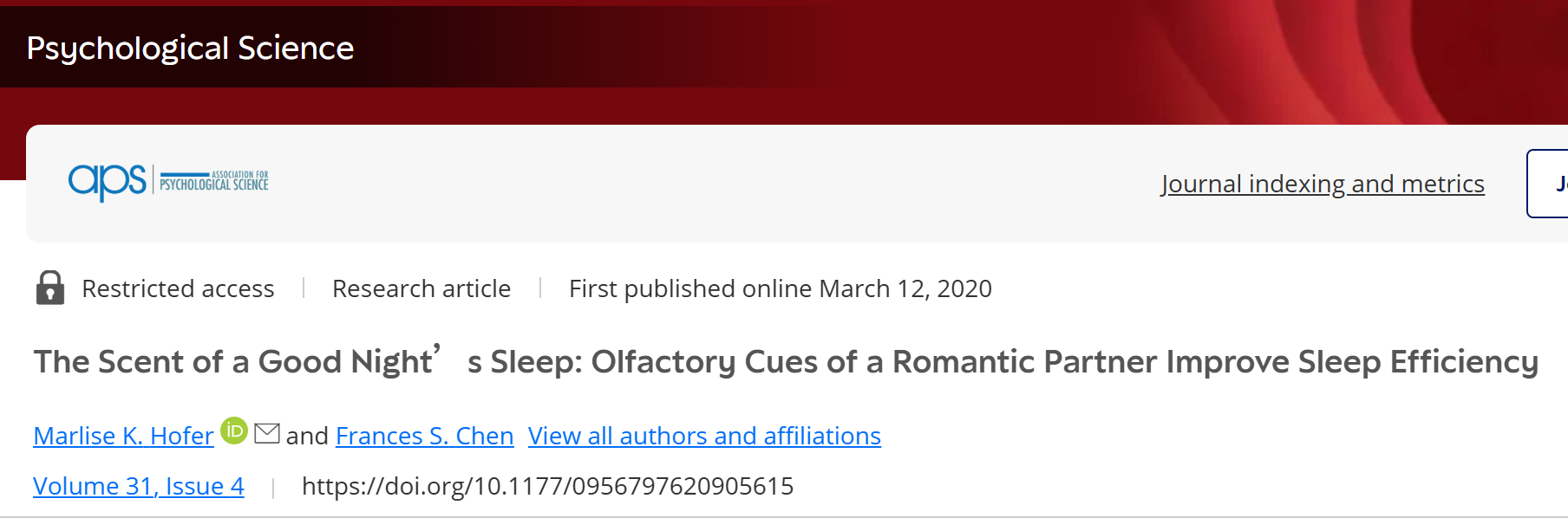 [3] Hofer, Marlise K., and Frances S. Chen. "The scent of a good night’s sleep: Olfactory cues of a romantic partner improve sleep efficiency." Psychological Science 31.4 (2020): 449-459.