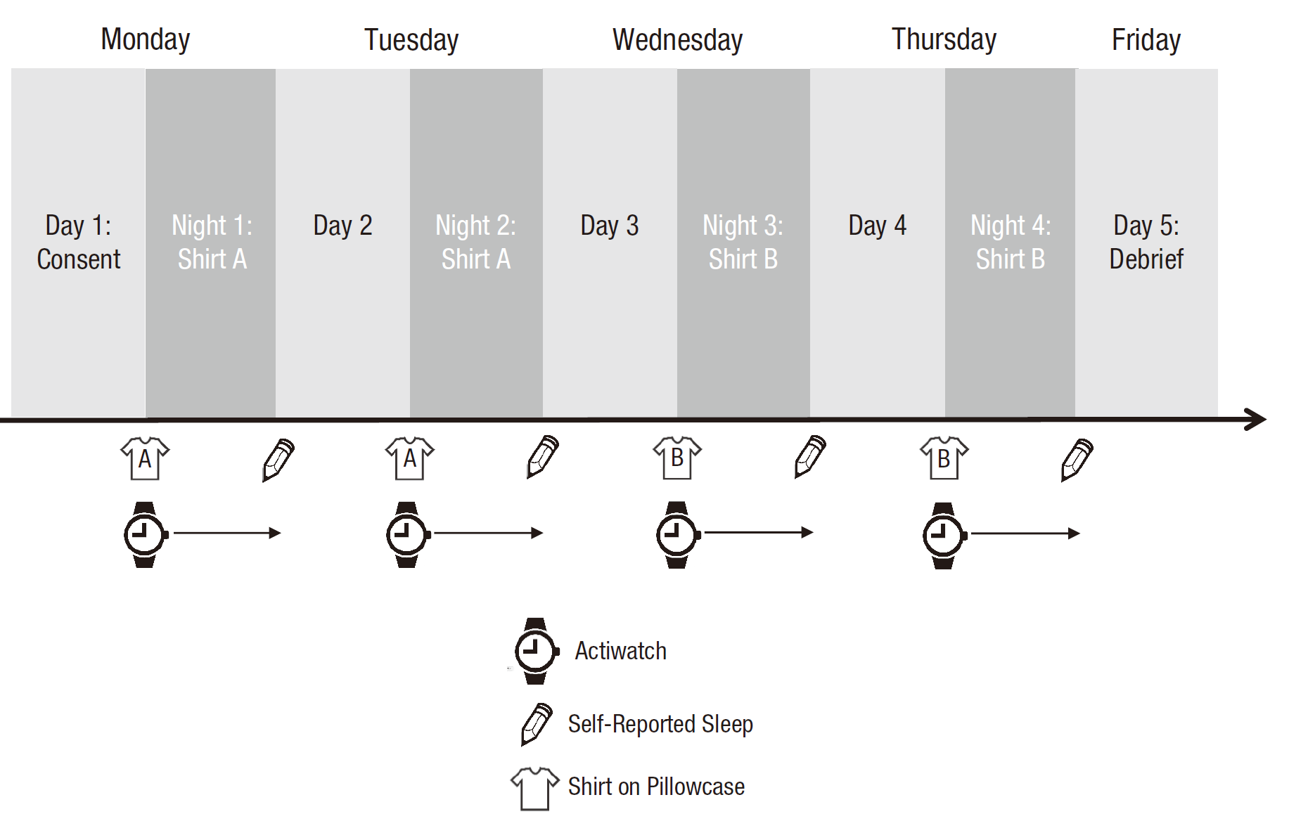 每位参与者在连续四个夜晚分别睡在两件T恤上,每件两晚。他们的睡眠质量通过两种方式进行评估。一是主观打分:每天早晨填写睡眠质量问卷;二是客观测量,佩戴睡眠监测手表,记录整夜的身体活动情况,用以计算睡眠效率——也就是睡觉时真正处于熟睡状态的时间比例。