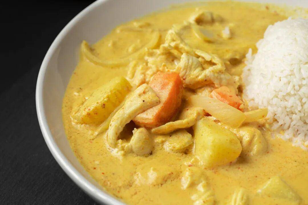 泰国咖喱,通常会加入罗望子、香茅、鱼露、月桂叶等非常富有东南亚风情的草本香料,还会使用椰浆,根据加的辣椒颜色不同,还能分为红咖喱、绿咖喱和黄咖喱。