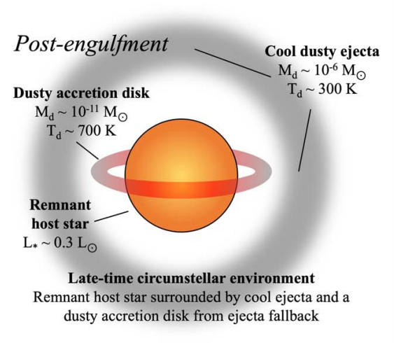 科学家把韦布望远镜测得的能谱分布(各个波长的能量分布)数据代入天体物理计算模型,得出恒星周围残余的热尘埃总量大约是太阳质量的400亿分之一,比500多天前数据的计算结果少了5万多倍,但尘埃变得很热,从550摄氏度上升到了990摄氏度。此外,韦布望远镜探测到3种发射谱线:波长4.05微米的布拉开α线、波长约4.3微米的疑似磷化氢线、波长4.38-5.15微米的一氧化碳线。而在500多天前的观测中,只能看到若干吸收谱线。这里稍微注解一下:发射谱线是热物质自己发出的光,吸收谱线则是光遇到冷物质后被扣留出的阴影。磷化氢的谱线特征符合570摄氏度的气体源,距离恒星应有33亿公里。综合对尘埃状况和发射谱线的这两个发现,说明在这500多天里,行星进入恒星时的喷出物(包括尘埃和气体)绝大部分弥散冷却到难以检测,而少量则朝着恒星身边回落下去,成为离恒星很近的炽热吸积盘。