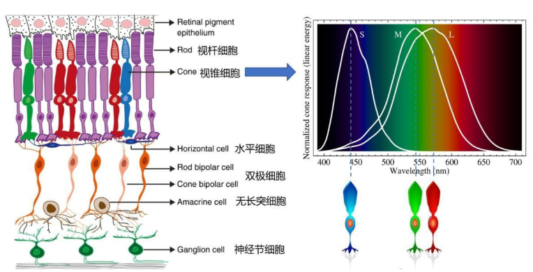 S型:对短波长(蓝光区域,420纳米附近)最敏感