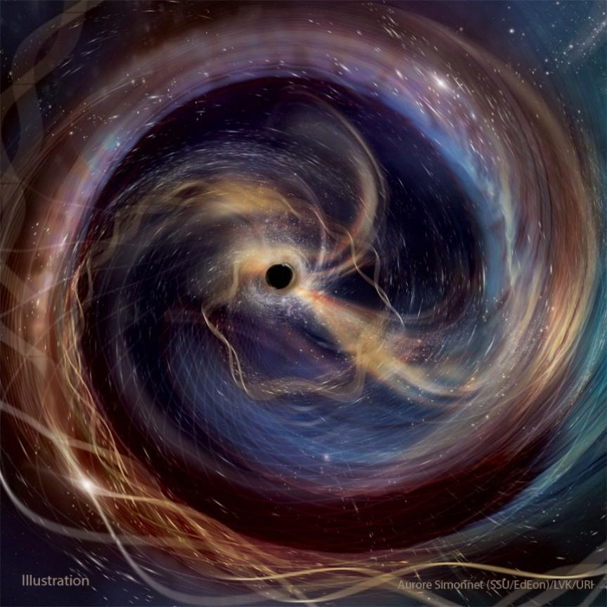 通过测量比较两个黑洞合并前的面积和合并后的面积,LVK合作组织验证了霍金的黑洞面积定理。图源:L. Reading-Ikkanda/Simons Foundation
