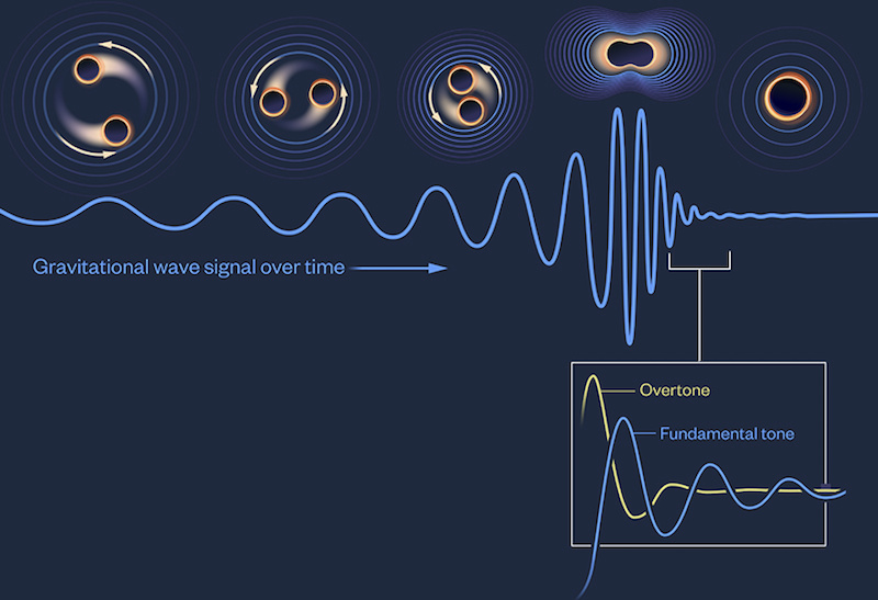 LVK合作组成功识别出了衰荡信号的主音和第一泛音模式。图源:L. Reading-Ikkanda/Simons Foundation