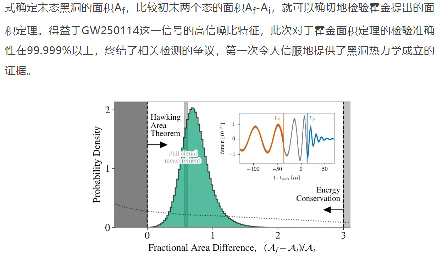 人类首次探测到由双黑洞合并释放的引力波,而这一过程正是当年启发霍金提出面积定理的物理情景。因此,双黑洞并合所产生的引力波信号,成为最自然、最直接的实验场景,用于检验面积定理以及黑洞热力学的基本规律。不过,2015年的观测由于信噪比不够高,对于黑洞面积定理的检验还无法做到十分精确。而今年观测到的引力波信号GW250114,是迄今为止最为清晰的引力波信号,信噪比达到了80,相比于之前的观测有了显著提升。这使科学家得以精确验证黑洞面积定理,为更严格测试广义相对论提供了新的可能。