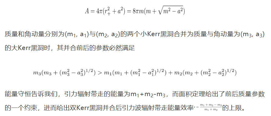 霍金在广义相对论背景下,考虑时空中的物质场满足类光能量条件时,给出了两个Kerr黑洞并合后发出的引力辐射能占据总能量的比值上限。霍金证明,在两个黑洞并合过程中需要满足面积定理,即当两个小黑洞碰撞并且合并在一起之后,形成的大黑洞的视界面积一定会大于两个小黑洞的视界面积之和[2]。结合Kerr黑洞的面积公式