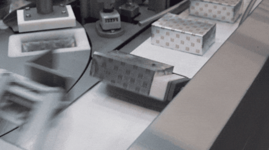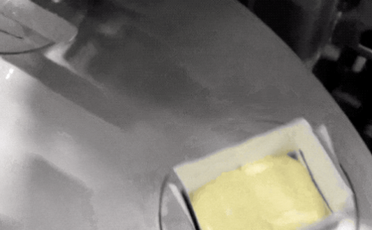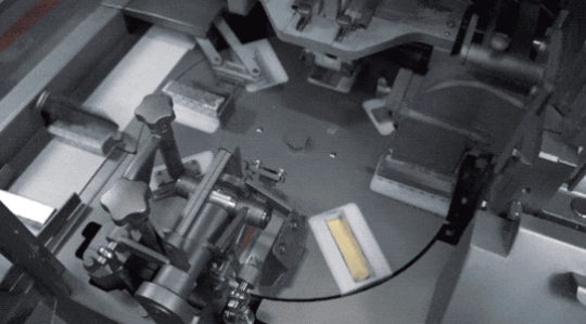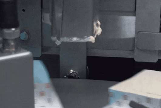 我们换另一款小长条的黄油,来看机器的整个操作流程。纸张下压形成盒子底部,然后灌入黄油,再折叠开口处,最后推出转盘,一个翻转,黄油块就成形了~收工!