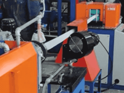 因为发泡膨胀会有很多热量,还要给它降降温。下图是通过风冷,再到定向辊牵引。