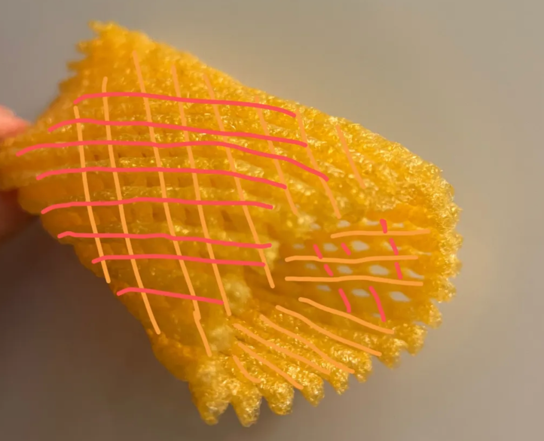 合理推测模具相交挤成立体网的这部分制作原理,应该是一样的。但是经过我的仔细观察,浴球花的间隙并不是菱形,而是六边形。这就说明,它挤出的过程,刨掉不发泡的因素,其他的比如模具的结构、运动方式,和我们水果网套也可能有些区别…...