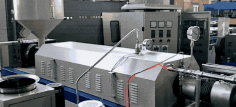 远远的那个料斗,装了很多塑料小颗粒,比如 LDPE 什么的。塑料小颗粒、活性剂与成核剂(有助于形成均匀泡沫)混合后,经过下面这一连串的剪切、挤压和加热,塑化熔融。