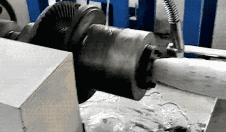 这个外齿轮带动着外模旋转,内齿轮带动着内模旋转,就让发泡网套的两层模具以相反的方向运转了。