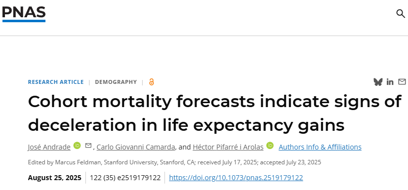 [1] Andrade, José, Carlo Giovanni Camarda, and Héctor Pifarré i Arolas. "Cohort mortality forecasts indicate signs of deceleration in life expectancy gains." Proceedings of the National Academy of Sciences 122.35 (2025): e2519179122.