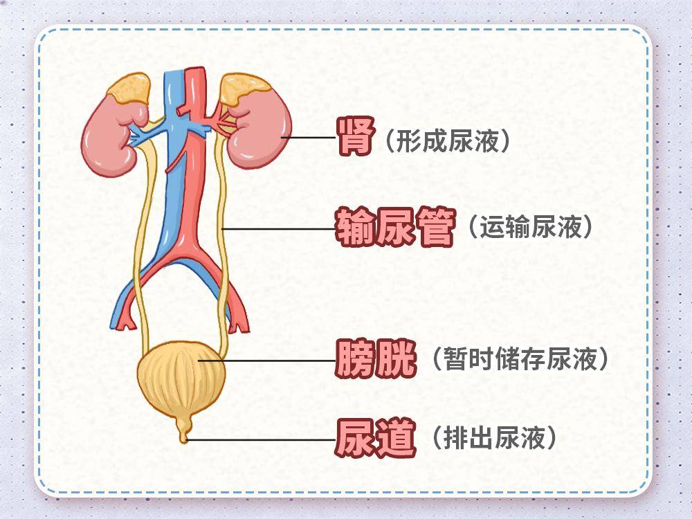 尿液的生成过程,血液中的成分首先经肾皮质的肾小球滤过,形成原尿;原尿再流经肾小管、集合管,汇入肾盏和肾盂,随后通过输尿管排入膀胱;膀胱储存尿液,当尿液积聚到一定量时,人会产生尿意,最终通过尿道排出体外。此外,肾脏通过肾动脉和肾静脉完成血液循环,为其功能提供支持。