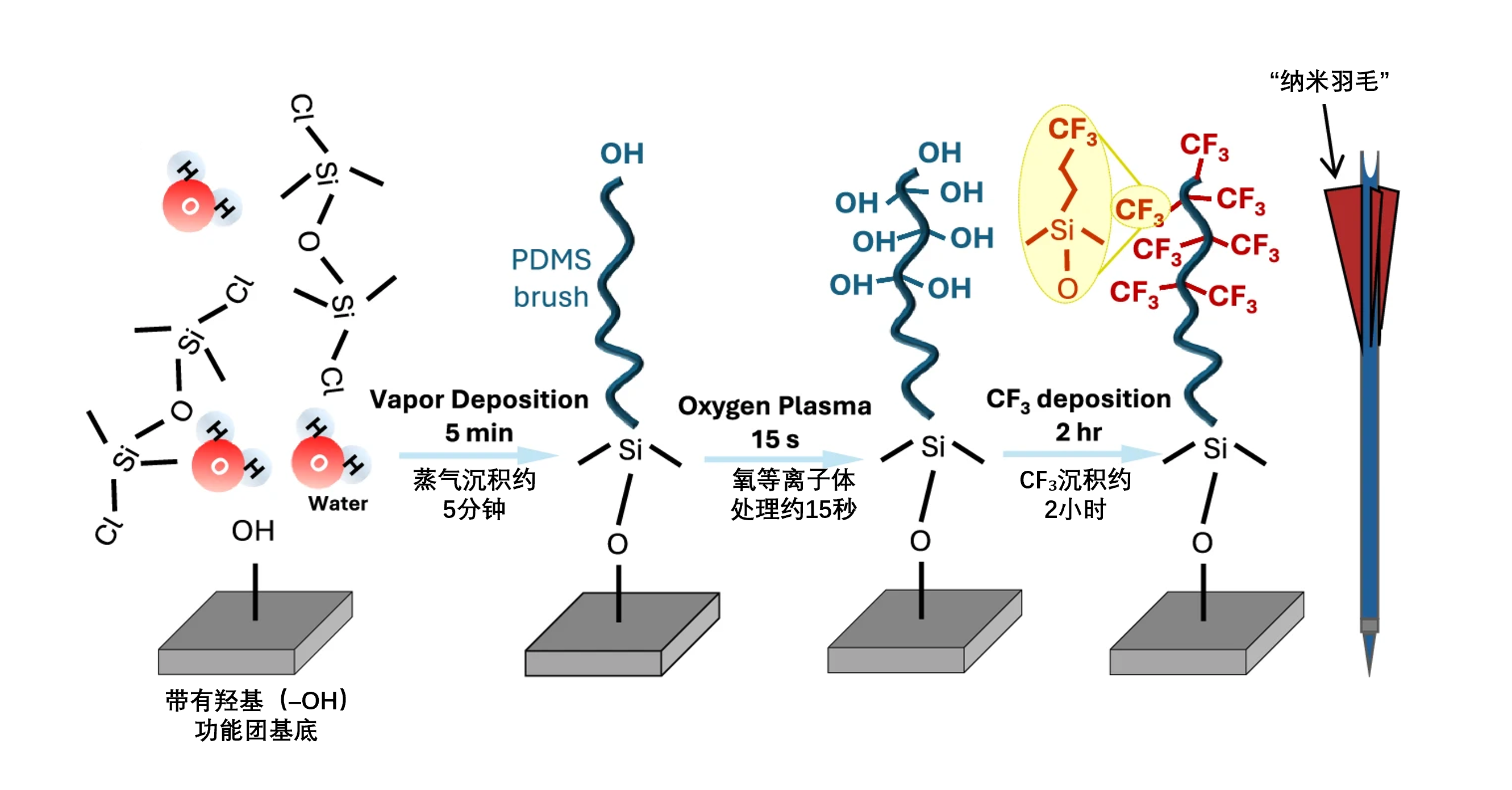 实验数据显示,每根PDMS刷毛大约能结合7个 -CF₃ 基团,在纳米尺度上,这些基团整齐排列,如同箭尾羽毛般展开,因此这种设计被形象地称为“纳米羽毛”。