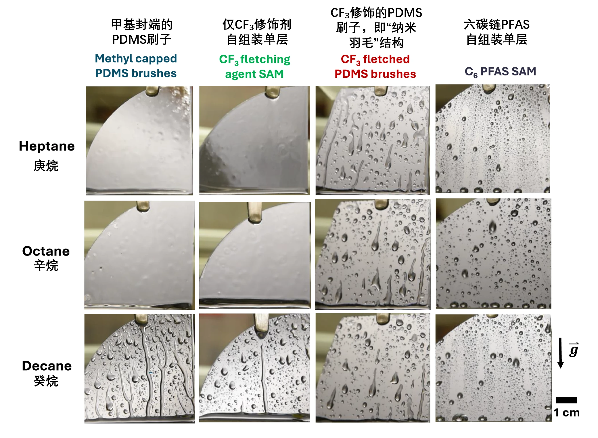 别看这“羽毛”小小,效果却出乎意料。研究团队发现,改性后的表面在多种低表面张力的油类测试中表现优异,油滴很难附着和扩散,其防油能力与目前常用的短链PFAS涂层几乎相当。