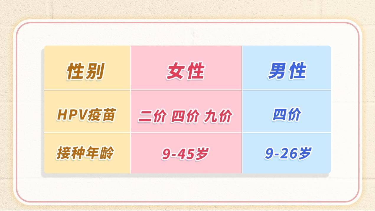 在咱们国家,疫苗的接种年龄有明确规定:女性可以接种二价、四价、九价疫苗,接种年龄是9-45岁;男性可以接种四价疫苗,接种年龄是9-26岁。