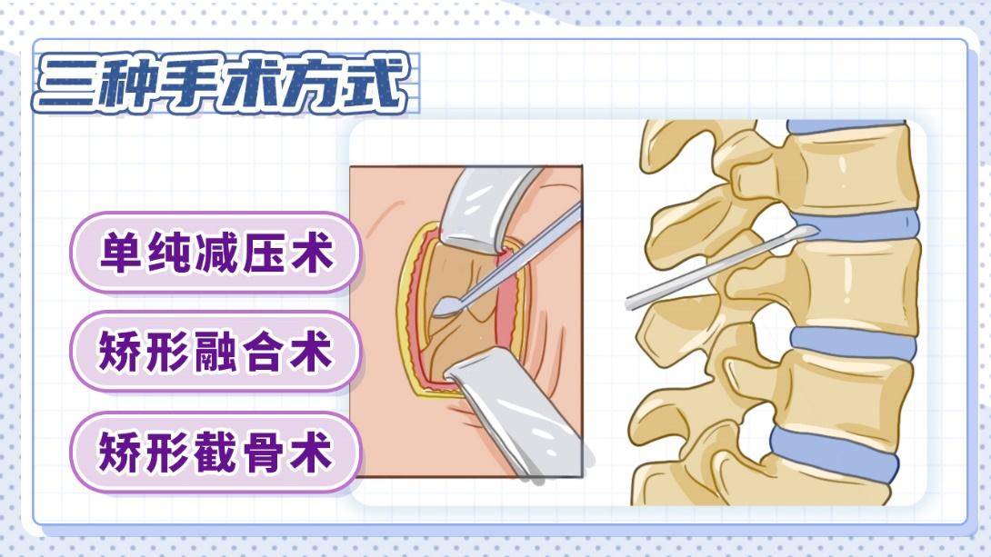 退行性脊柱侧凸症根据畸形程度和患者具体情况,可选择以下三种手术方式: