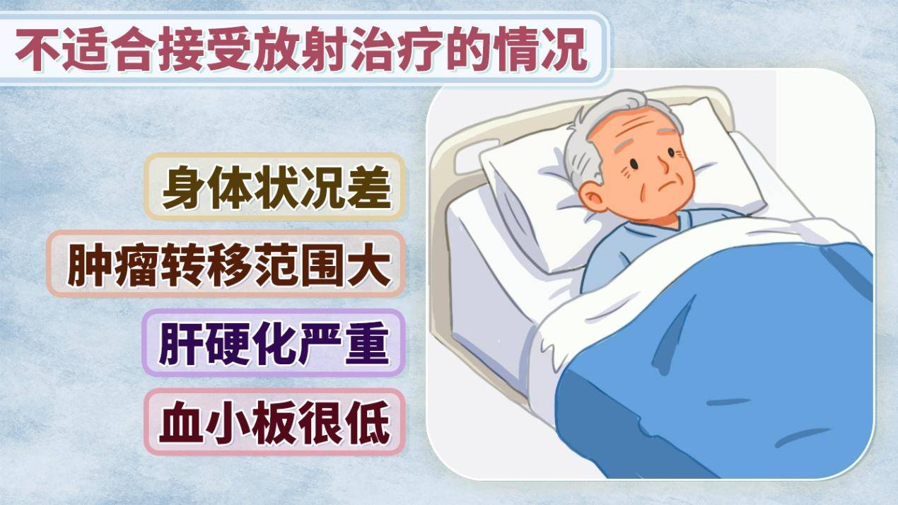 第一种情况,是通过放疗可以达到根治目的。比如肿瘤病变比较局限,但患者可能因为肝功能不好、年龄较大,或是有严重合并症,无法耐受手术,要是这个肿瘤还比较小,尤其是直径小于5cm,这类患者通过放疗完全能实现根治。
