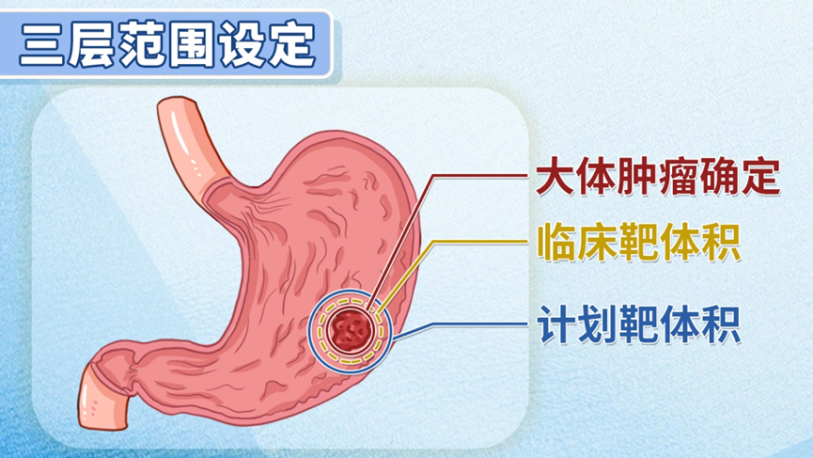 放疗需分次进行,而治疗过程中存在诸多“变量”,例如患者每次治疗的体位可能有细微差异,胃作为空腔器官,会随蠕动改变位置。为应对这些变量,医生会在临床靶体积的基础上再扩大一个范围,形成计划靶体积,保证射线能精准命中肿瘤区域。