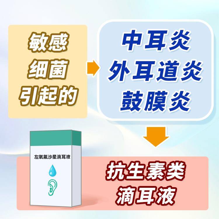 左氧氟沙星滴耳液等抗生素类滴耳液,具有抗菌、消炎、清洁、止痒、收敛及润滑耳道的作用,主要用于敏感细菌引起的中耳炎、外耳道炎、鼓膜炎等疾病。