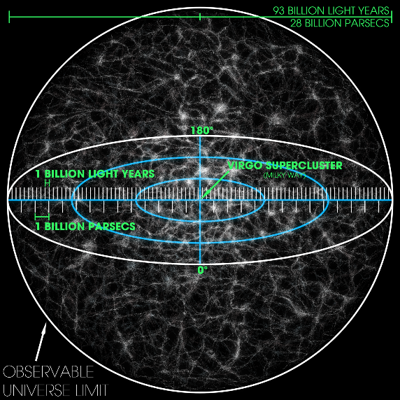 从理论上讲,宇宙演化的总时间以及在这段时间内宇宙的膨胀程度,共同决定了可观测宇宙半径的大小。我们已经知道宇宙演化的总时间约为138亿年。宇宙膨胀程度是由前文所述的尺度因子来衡量,尺度因子的演化通过测定宇宙中各物质组分的比例经由宇宙学中的弗里德曼方程得出。结合现代天文学与宇宙学的观测数据,可以计算得出可观测宇宙半径约为465亿光年。
