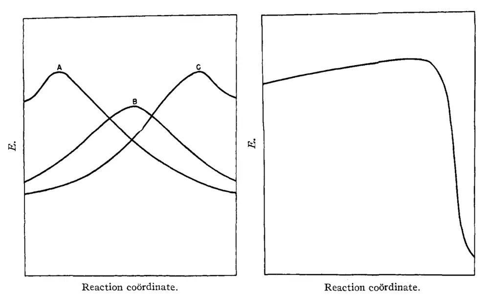图7.哈蒙德原始论文中关于能量和反应坐标的示意图。(左)A为放热反应中结构和能量与原料接近的早期过渡态,C为吸热反应中结构和能量与产物接近的晚期过渡态,B为热中性反应的过渡态,其能量和结构不能用类似的方法推测。(右)反应路径中不应出现的悬崖形貌(剧烈放热反应的过渡态结构与产物接近,但能量与原料接近)。图片来源:J. Am. Chem. Soc.1955, 77, 334.