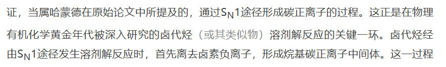 通常伴随着体系能量的升高,是溶剂解反应的决速步。根据哈蒙德假说,其过渡态结构应当与相应的碳正离子接近。当时的有机化学家已经非常熟悉,碳正离子的稳定性随叔碳/仲碳/伯碳/甲基的顺序依次减弱,同时相应的溶剂解反应的速率也随之减慢(伯碳和甲基卤代物甚至无法通过SN1途径发生溶剂解反应)。对于叔碳和仲碳离子的形成过程来说,显然后者的能量升幅更大。如果把哈蒙德假说对过渡态结构和能量关系的预言再向前推进一步,这种能量升幅的差别无疑意味着形成仲碳离子的过渡态更加晚期。如果以断键的碳卤原子间距作为反应坐标,那么可以认为在形成仲碳离子的过渡态中,碳卤原子的间距要比叔碳离子体系更远。这便是基于哈蒙德假说,对卤代烃溶剂解反应的关键过渡态结构做出的一种估计。至于这种估计是否可靠,我们不妨联想一下劈柴的场景。假如木质特别松脆,斧子只需楔进去一点,柴禾就会自己裂开(放热反应/早期过渡态);而当木质十分致密时,得用力劈到底端才能成功(吸热反应/晚期过渡态)。显然,哈蒙德假说蕴含的思想与人们的日常生活经验是一致的。
