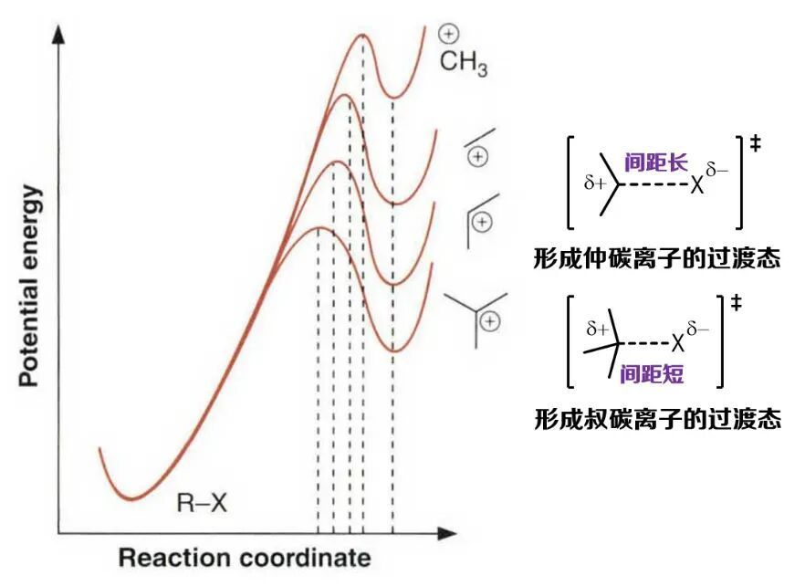 图8. 用哈蒙德假说估计碳正离子形成过程的过渡态能量和结构。左图来源:参考文献[17]。