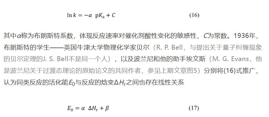 敏锐的读者朋友一定已经注意到,拓展哈蒙德假说内涵的过程触及了反应热力学性质与动力学行为的内在联系:一般地,如果同类反应的吸热(或放热)程度越高,那么其速率将越慢(或越快)。早在1924年,丹麦化学家布朗斯特(J. N. Brønsted)在研究酸催化酯或醚的水解反应时,首先指出其速率常数k的自然对数与酸催化剂的解离平衡常数pKa的负值线性相关