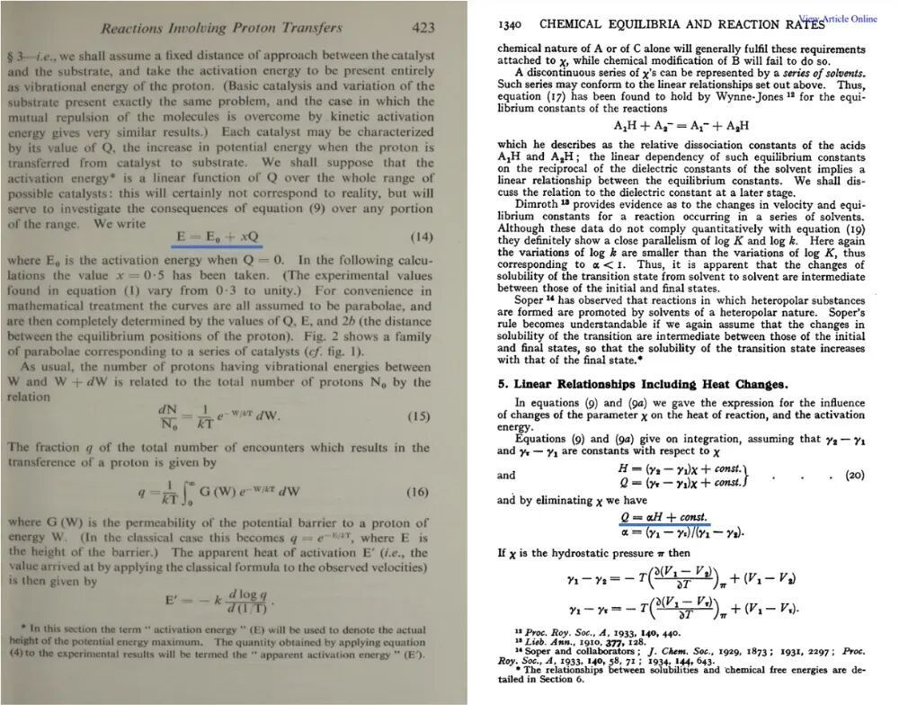 图9. 贝尔(左)和埃文斯、波兰尼(右)关于BEP方程(用蓝线标记)的原始论文。图片来源:Proc. R. Soc. London, Ser. A1936, 154, 414. Trans. Faraday Soc.1936, 32, 1333.