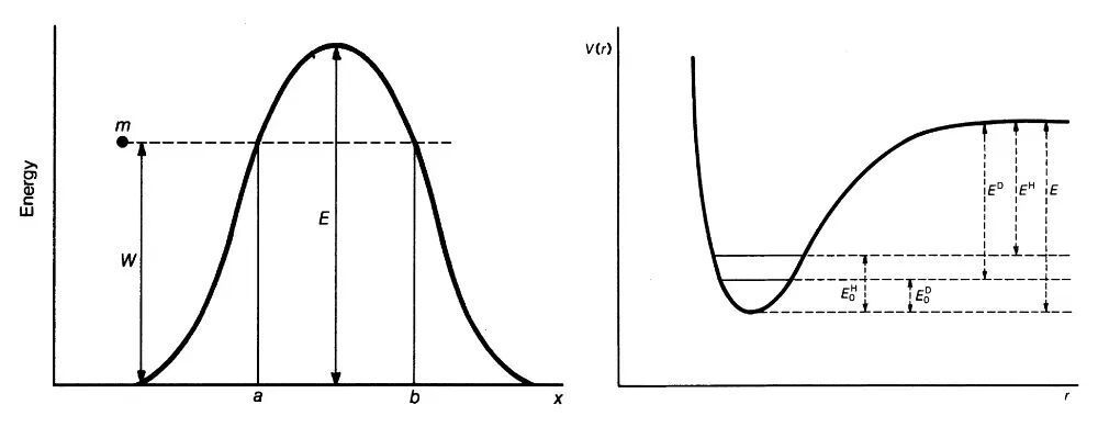 图10.(左)能量为W的粒子m穿透高度为E的势垒的示意图,势垒宽度为b–a。(右)碳–氢(氘)键的解离曲线示意图,曲线底部的两条水平线段表示碳–氢(氘)键伸缩振动的零点能。图片来源:参考文献[16]。