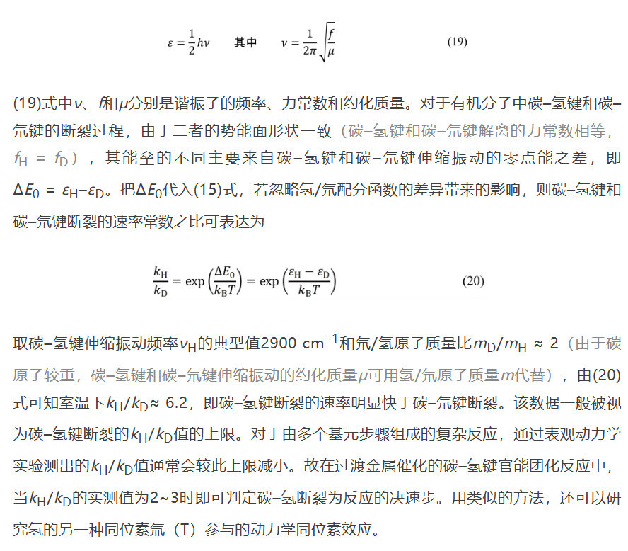 量子隧穿是从第一性原理导出的严格结论。无论它多么不合“常理”,只要我们认同量子力学的基本假设,就必须接纳它的存在。问题在于,量子隧穿能否在化学反应中导致可观测的实验结果呢?1931年,美国化学家尤里(H. C. Urey)分离出氢的同位素氘(D)(他因此获得了1934年诺贝尔化学奖),翻开了同位素化学的新篇章。化学家们很快发现,氢/氘动力学同位素效应是实验观测量子隧穿的绝佳场景。动力学同位素效应源于分子体系的另一种量子特征——零点振动能。在量子力学中如果使用谐振子模型处理分子的内振动,会发现分子即使在绝对零度下也并非完全静止(否则谐振子将同时具备确切的位置和速度,违反不确定性原理),而必然在一定程度上发生“零点振动”,其能量为
