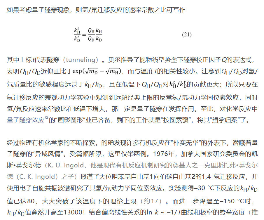 测的抛物线型势垒宽仅63.5 pm),可以断定量子隧穿是该氢迁移反应的主要途径。在生命体内的酶促反应中也有量子隧穿的踪迹。1997年,《美国国家科学院院刊》登载了一篇关于马肝乙醇脱氢酶(LADH)催化苄醇氧化反应的论文。研究人员通过测量氘/氚取代的苄醇参与反应的动力学行为,确认了量子隧穿现象的存在;并且发现对LADH活性位点附近的氨基酸残基进行定点突变,还能调控量子隧穿的强弱。考虑到哺乳动物乙醇脱氢酶的结构保守性,不妨想象:无论是独自临窗小酌,抑或与朋友开怀畅饮,量子隧穿都在我们的肝脏中参与酒精的代谢呢!