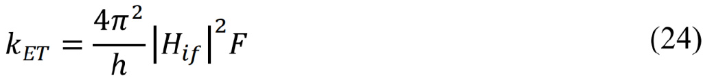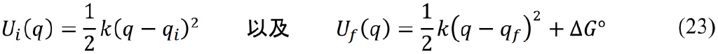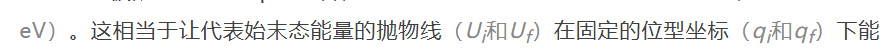 来表示。其中qi和qf分别代表反应始末态的平衡结构,ΔG°是电子转移过程的吉布斯自由能变化(即反应的热力学驱动力,自发过程满足ΔG° < 0)。那么根据等构型、等能量的要求,电子转移一定发生在两条抛物线的交点处,其速率常数可以用量子力学中描述态–态跃迁的费米黄金规则
