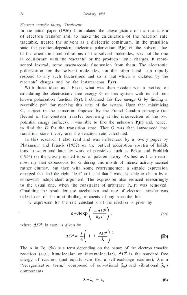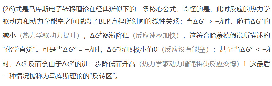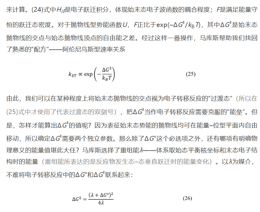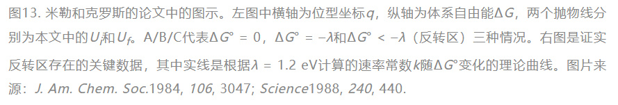 图12. 马库斯的诺贝尔奖演讲中关于电子转移反应速率常数和重组能的公式。图片来源: