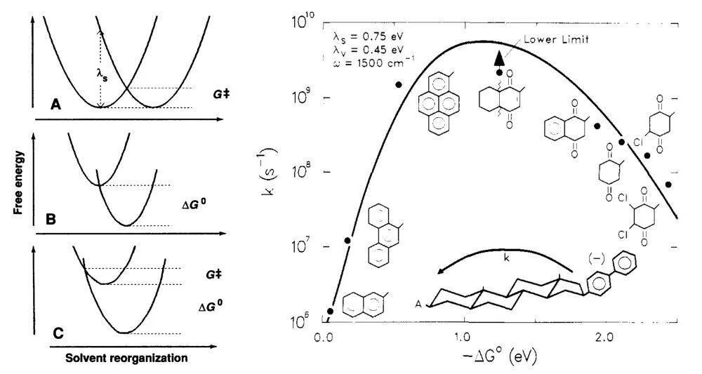 其始态(i)和末态(f)的电子结构迥异(电中性或自由基离子),处在不同的势能面上,因此无法直接套用过渡态理论计算反应的速率常数。溶液中电子转移反应的动力学是二十世纪五十年代物理化学的研究热点。为了解答这个问题,化学家们曾经提出了许多方案。但笑到最后的,是美籍加拿大裔化学家马库斯(R. A. Marcus)的电子转移理论。