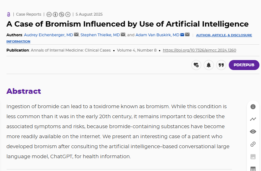不久前《内科医学年鉴·临床病例》(Annals of Internal Medicine: Clinical Cases)就报道了一起神奇的病例——有人因为听信 AI,把自己吃成了多年未见的溴中毒。