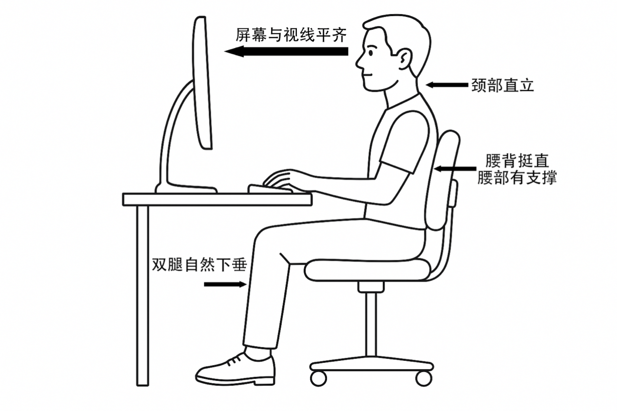 √坐姿:保持腰背挺直,颈部直立,腰部有支撑。电脑屏幕的高度维持在与视线平齐范围内,同时避免耸肩。