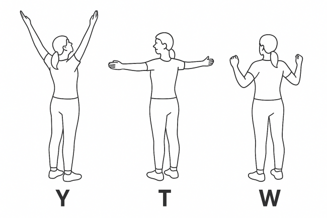 该动作完成过程中双上肢和躯干形成“YTW”字母的形状,因此而得名。该训练可每天进行2~3组,每组20~30次。动作要领如下。