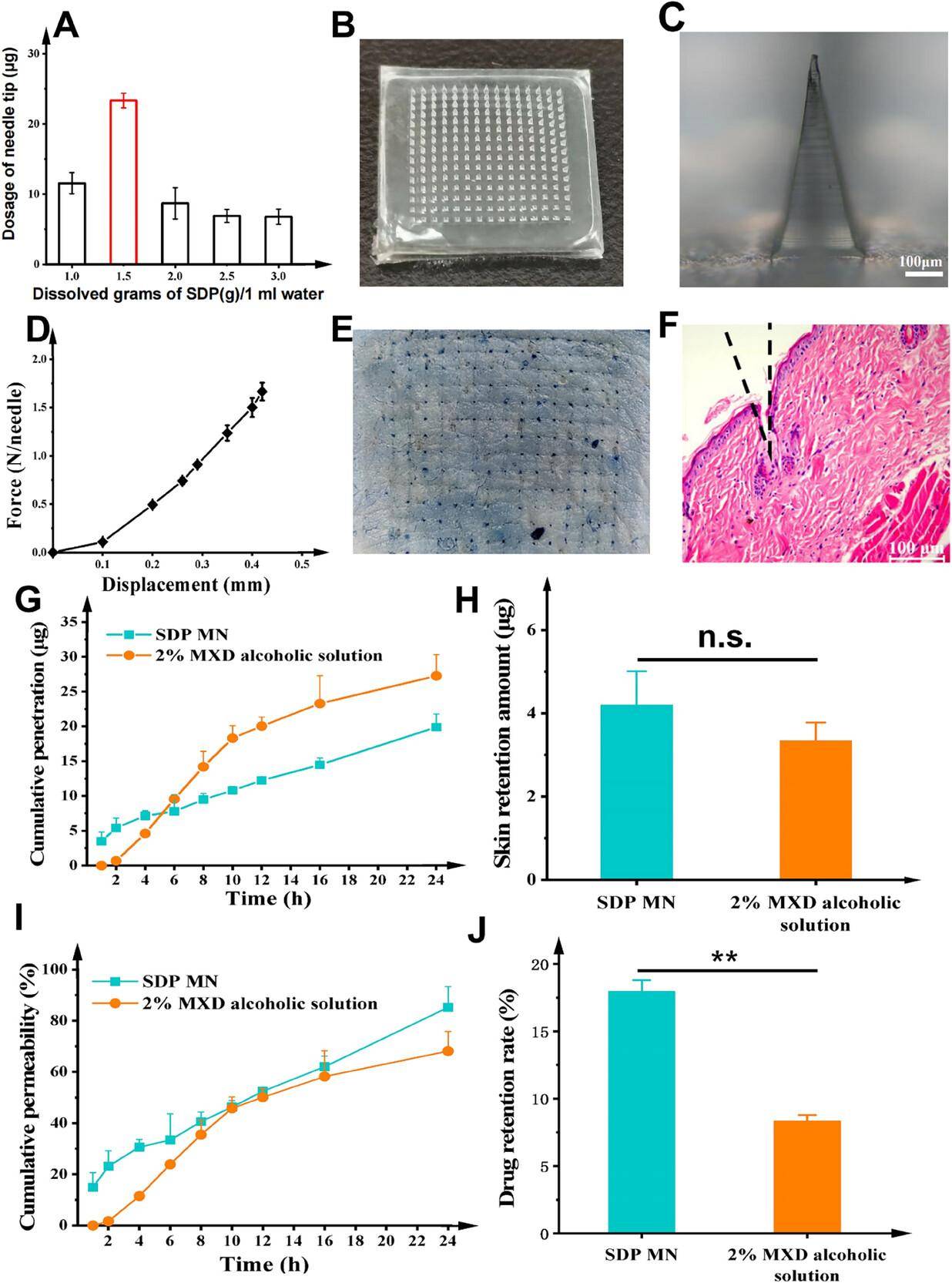 在此基础上,研究者制备了可溶性微针贴片,将甜菊苷与米诺地尔共同嵌入微针结构中。该贴片在使用时能在皮肤表面缓慢溶解,药物经由微针形成的微通道直接进入真皮层。体外实验显示,这一系统的药物透皮渗透率达85%,皮肤内药物滞留量为18%,均明显优于传统的米诺地尔酒精溶液。