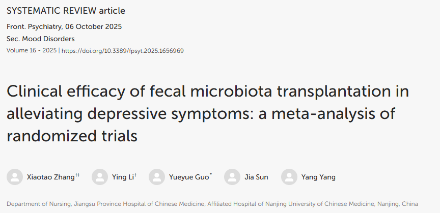 [1] Zhang, Tao Xiao, et al. "Clinical efficacy of fecal microbiota transplantation in alleviating depressive symptoms: a meta-analysis of randomized trials." Frontiers in Psychiatry 16 (2025): 1656969.