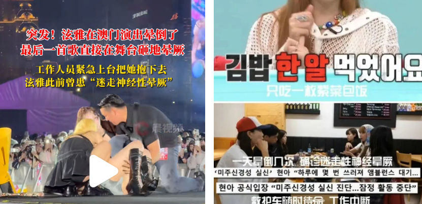 11 月 9 日,韩国歌手金泫雅在舞台上表演时突然晕倒。金泫雅曾在节目里说自己确诊了迷走神经性晕厥,一天晕倒几次。