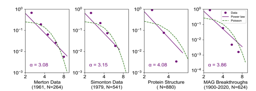 而实际中,无论是默顿、西蒙顿手工整理的科学突破案例集,蛋白质结构库PDB,还是根据D-index从4000万篇论文选取D-index排名前2%,再经过Llama大模型识别出的624个多重发现案例,两个科研突破的间隔时间,都接近幂律分布,如图2所示。