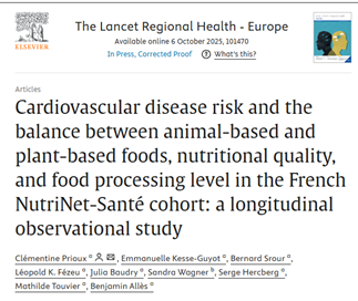 [1] Prioux, Clémentine, et al. "Cardiovascular disease risk and the balance between animal-based and plant-based foods, nutritional quality, and food processing level in the French NutriNet-Santé cohort: a longitudinal observational study." The Lancet Regional Health–Europe (2025).
