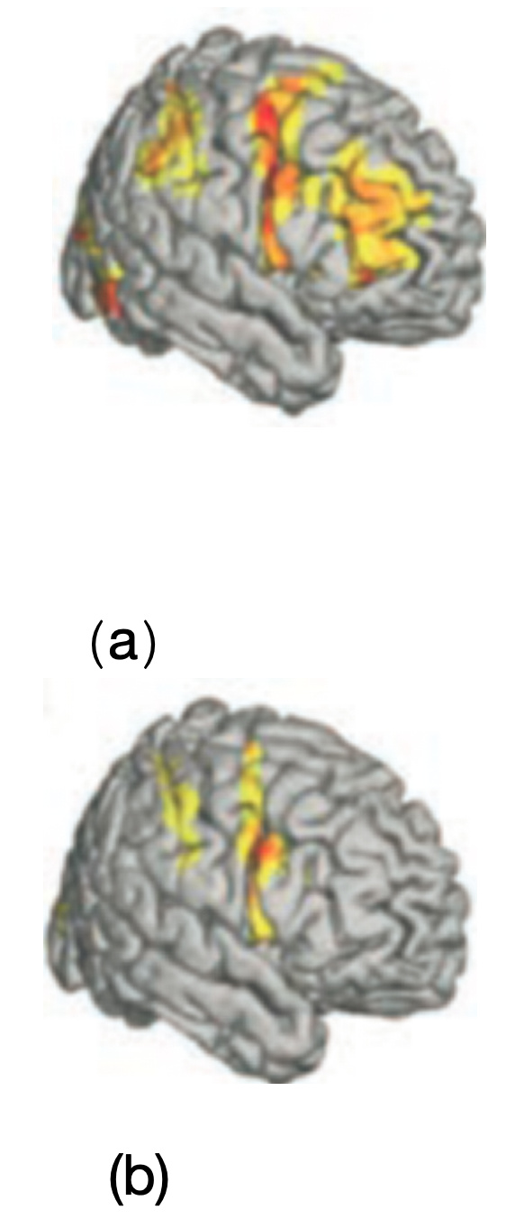 图2 在双目竞争实验中用fMRI检测当被试觉知到时增强活动的脑区。(a)被试主动报告其感知时,额叶活动有所增强;(b)被试无须主动报告时,当被试知觉到刺激时,额叶区的神经活动并不增强,但依然激活了枕叶和顶叶区。[9]